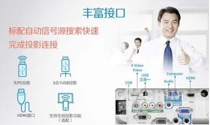 會(huì)議使用的投影機(jī)經(jīng)常需要連接不同的設(shè)備進(jìn)行演示,所以對接口的兼容性有較高的要求。愛普生商務(wù)投影機(jī)新品擁有豐富的接口選擇,在提升效率的同時(shí)全面滿足各類設(shè)備的連接需求。并且用戶通過USB線纜連接投影機(jī),即可進(jìn)行聲音、圖像和控制信號(hào)的實(shí)時(shí)輸出投影。即使未攜帶電腦只需插入U(xiǎn)SB存儲(chǔ)卡,就可在無PC環(huán)境下進(jìn)行圖片和視頻文件投影輸出,為用戶提供了靈活自由的連接方式選擇。
