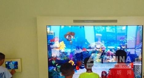 兩個(gè)互動(dòng)平板電腦加上一個(gè)交互式、90英寸封閉的顯示器,是為了讓孩子們體驗(yàn)生動(dòng)的彩色水族館。