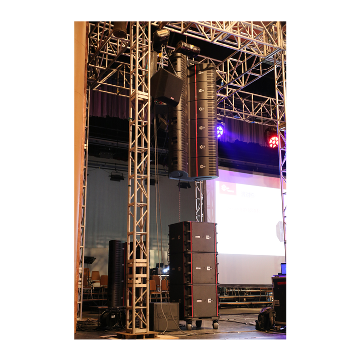 胡:視聽會26號下午2點(diǎn)正式開始,我們24號晚上就將設(shè)備運(yùn)進(jìn)場,25號早上搭設(shè)桁架,下午開始安裝和調(diào)試。主擴(kuò)系統(tǒng)采用立體聲配置,我們在舞臺左右兩側(cè)各吊掛一個由6只Anya模塊構(gòu)成的陣列,每個Anya陣列下面堆疊3只Otto模塊,提供更多的低音支持。