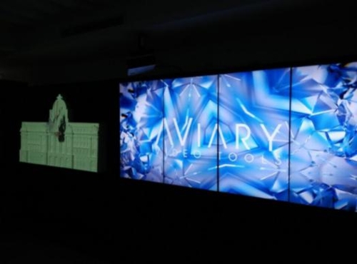 1樓動態(tài)展廳搭建了配合Hippotizer的迷你建筑投影模型,從設計到素材制作全部由公司團隊制作完成,背景模型參考外灘匯豐銀行大樓進行設計,使客戶在展廳即可參觀通過媒體服務器配合投影機營造的建筑投影特效。邊上也有用Aviary的4K媒體播放器Parakeet連接4塊拼接屏進行超高清片源的播放。