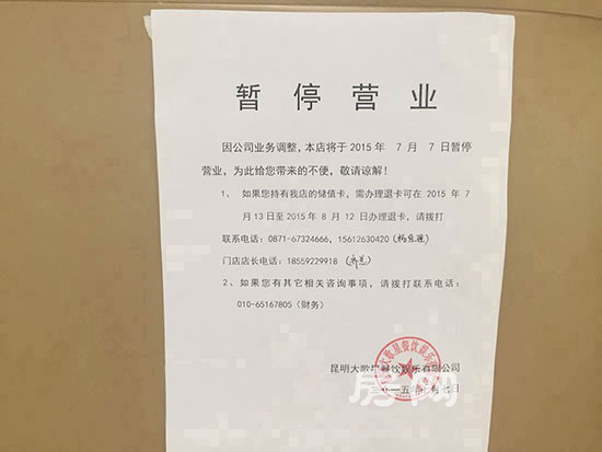 位于商場三樓的大歌星KTV,卻發(fā)現(xiàn)已經(jīng)是大門緊閉,店面防護(hù)門上貼有暫停營業(yè)的公告,公告時間為2015年7月7日,公告顯示:“因公司業(yè)務(wù)調(diào)整,本店將于2015年7月7日暫停營業(yè),為此帶來的不便,盡情諒解!如果持有我店的儲值卡,需辦理退卡可在2015年7月13日至2015年8月12日辦理退卡。”并留有退卡和其他事務(wù)咨詢的聯(lián)系電話。由此看來,萬達(dá)大歌星KTV已關(guān)店超過一周了。