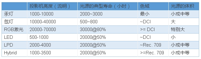 而隨著國(guó)內(nèi)市場(chǎng)對(duì)于高亮度工程投影機(jī)的需求不斷攀升,如今的工程投影機(jī)市場(chǎng)在顯示技術(shù)方面也有了新的變化。從最傳統(tǒng)的燈泡投影到LED投影機(jī)、激光投影,各種不同的投影技術(shù)都試圖在巨大的市場(chǎng)中找到一席之地。下面的表格從技術(shù)角度對(duì)不同的投影技術(shù)做了橫向的對(duì)比分析。