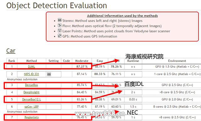 近日,海康威視研究院在KITTI評測中排名世界第一,表明其在計算機視覺算法上取得了重大突破。在車輛檢測和車頭朝向估計兩項任務中,分別取得了87.27%與83.75%的AP(Average Precision)值,均排名第一。參加這項評測的研究機構及高校包括百度深度學習研究院、NEC北美研究院、加州大學等世界頂級研究團體。