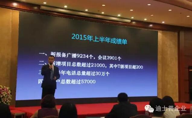 2015年上半年經(jīng)濟(jì)環(huán)境嚴(yán)峻,市場競爭激烈,但在迪士普企業(yè)高管和全體營銷中心家人的努力下,企業(yè)的項(xiàng)目量、客戶量以及銷售額等都持續(xù)呈上升趨勢。各部門總監(jiān)都展示了各自上半年驕人的成績,并充滿信心地承諾下半年的奮斗目標(biāo)。