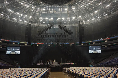 4月21日和22日的兩場(chǎng)演出使用Meyer Sound大型擴(kuò)聲線性陣列LEO系統(tǒng),由每邊14只LEO-M、2只LYON-W和2只LYON-M共36只揚(yáng)聲器組成主擴(kuò)聲系統(tǒng),每邊12只1100-LFC低頻控制單元作為主系統(tǒng)的低頻系統(tǒng)。側(cè)方補(bǔ)聲系統(tǒng)由每邊11只LYON-M和1只LYON-W揚(yáng)聲器組成。8只MINA揚(yáng)聲器負(fù)責(zé)前排補(bǔ)聲,地面低音組由16只1100-LFC組成,14只MJF-212A用于舞臺(tái)監(jiān)聽。整套系統(tǒng)由1臺(tái)Galileo 616 AES和4臺(tái)Galileo Callisto 616揚(yáng)聲器管理系統(tǒng)驅(qū)動(dòng)和優(yōu)化。