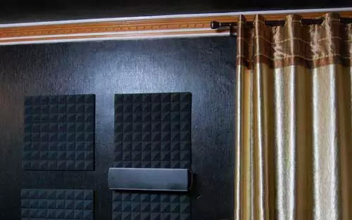 對(duì)于吸音,還用了十塊金字塔形吸音海綿,貼在第一反射點(diǎn)與后環(huán)繞處,價(jià)格便宜(一塊38元),施工簡單。
