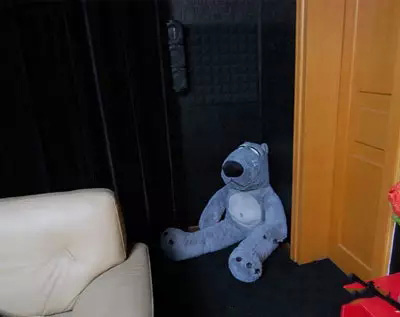 這東西小的不起作用,必須大個(gè)。這個(gè)倒霉熊站起身足有1米6。等同一個(gè)女生的大小。面料是超柔南韓絨,里面填充純?nèi)SPP棉。抱著非常有彈性。低頻的波長較長,至少這么大個(gè)的才能鎮(zhèn)住墻角。從它手上拿的4810遙控器可以大概感覺到大小。呵呵,四大天王鎮(zhèn)駐波。