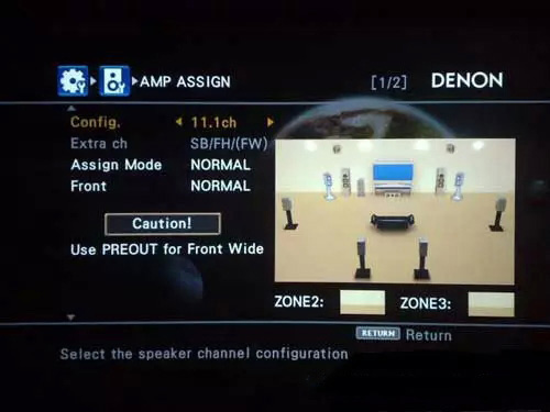 為了打消一些人的疑惑,下午特地跑回家拍了4810的菜單。有圖有真相!這是放大器設(shè)置項(xiàng)的11.1聲道擺位圖.下面的一行英文意思是“必須前級(jí)輸出增寬聲道”。因?yàn)?810只內(nèi)置了9聲道的放大,所以必須將增寬聲道接后級(jí)才能實(shí)現(xiàn)11聲道的輸出。