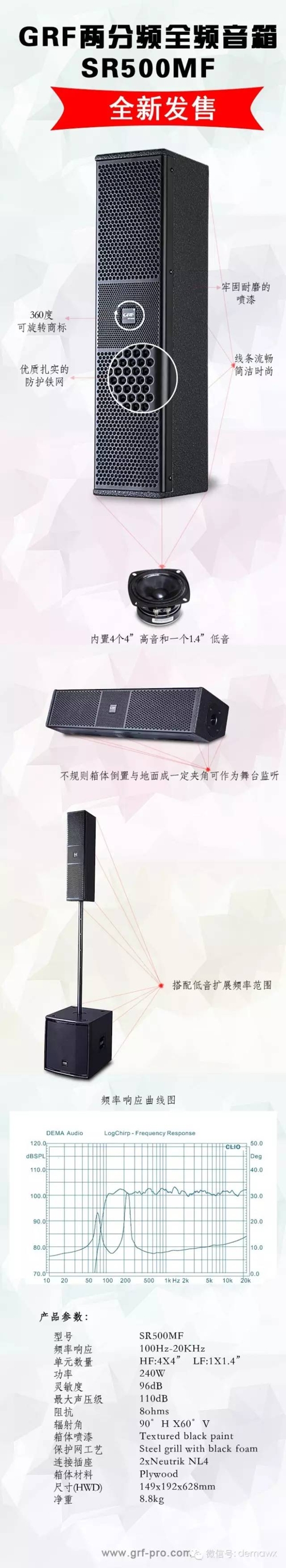 SR500MF內(nèi)置4個(gè)4英寸的低頻單元及1個(gè)1.4英寸的高頻驅(qū)動(dòng),中高音細(xì)膩通透,低音飽滿富有力度,搭載的可旋轉(zhuǎn)高音號(hào)角,使得擴(kuò)聲平滑且可根據(jù)需要調(diào)整指向性,箱體采用高級(jí)的樺木夾板,表面采用防磨防水噴漆,抗壓防損耐腐蝕能力強(qiáng),高強(qiáng)度的網(wǎng)罩內(nèi)嵌入GRF可旋轉(zhuǎn)商標(biāo),可根據(jù)水平或垂直安裝需要進(jìn)行調(diào)整。