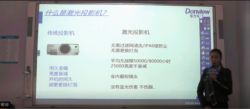 “本次展會為大家?guī)淼氖菛|方中原激光投影機(jī)+白板一體機(jī)組合方案。什么是激光投影機(jī)呢?我們都知道傳統(tǒng)的投影機(jī)用久了會變暗,開機(jī)時間非常的久并且需要頻繁的更換燈泡清洗過濾網(wǎng),而我們的激光投影機(jī)是無需清洗過濾網(wǎng)也無需更換燈泡,因?yàn)樗鞘褂霉庠窗l(fā)光的,它可以做到平均使用無故障50000~80000小時。5萬小時是一個怎么樣的概念呢?我們可以做這樣一個換算,假如每天在教室使用10小時,每年使用250天,那么使用超過8年是完全沒有問題的,最重要的是它沒有藍(lán)光傷害,不傷害眼睛。