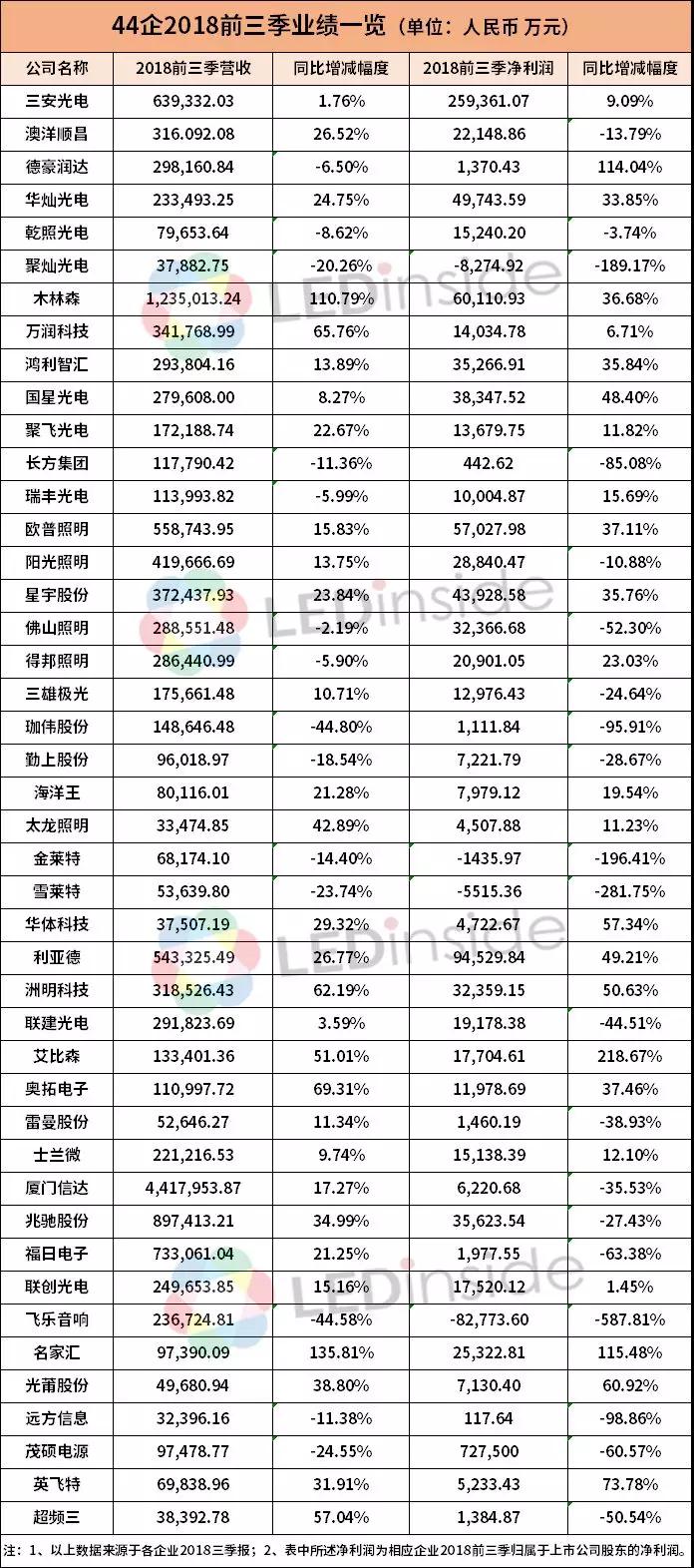 秋意漸濃,A股上市企業(yè)三季報(bào)披露已基本結(jié)束。據(jù)LEDinside不完全統(tǒng)計(jì),截至10月31日,共有44家LED相關(guān)企業(yè)披露2018年第三季度報(bào)告。上中下游龍頭企業(yè)三安光電、木林森以及歐普照明毫無懸念,依舊碩果累累,尤其是木林森,營收同比增長超100%。