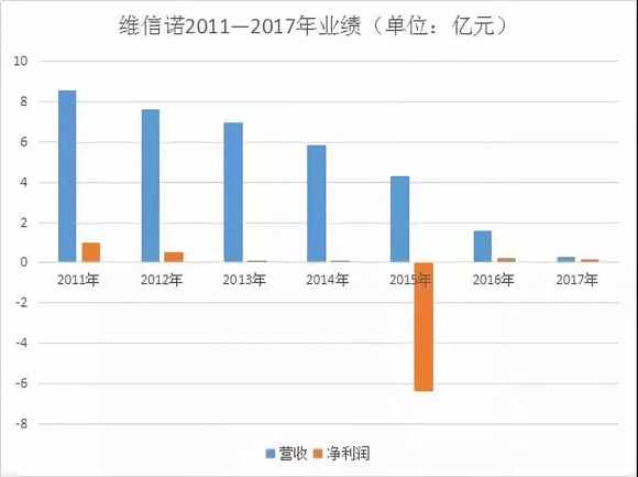 筆者對(duì)比了近幾年來維信諾的年度業(yè)績(jī):2011年—2017年全年?duì)I收分別為8.57億元,7.62億元,6.97億元,5.83億元,4.30億元,1.59億元,0.31億元,歸屬于上市公司的凈利潤(rùn)分別為1.02億元,0.55億元,0.14億元,0.12億元,-6.41億元,0.26億元、0.15億元。