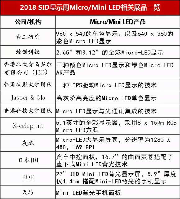 在2018 SID顯示周上,臺工研院、錼創(chuàng)科技、香港北大青鳥顯示有限公司(JBD)、韓國慶熙大學團隊、Jasper & Glo、香港科技大學團隊、X-celeprint、友達、日本JDI、BOE、天馬紛紛展示了Mini LED 和Micro-LED的最新產(chǎn)品。