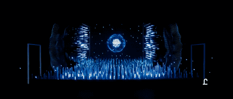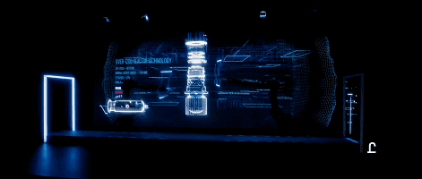 在這個多媒體空間中,投影內(nèi)容以冷色調(diào)藍白光為主,營造出機械感和未來感。