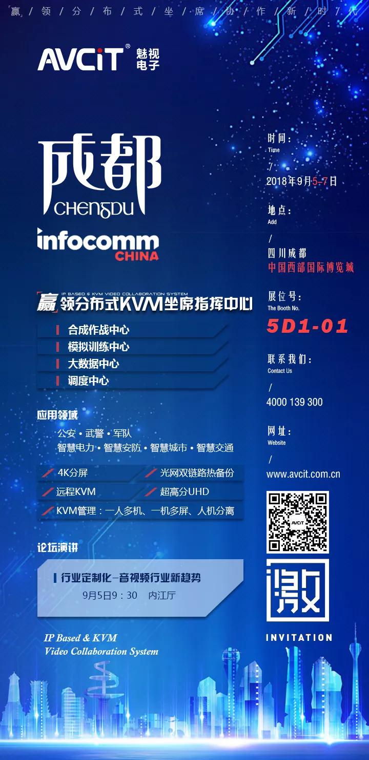 2018年9月5日—7日,AVCiT魅視將攜極具前瞻引領(lǐng)的產(chǎn)品技術(shù)和創(chuàng)新應(yīng)用解決方案,誠意亮相『首屆成都Infocomm China』——中國西部,一帶一路,機(jī)遇無限,價(jià)值共享!