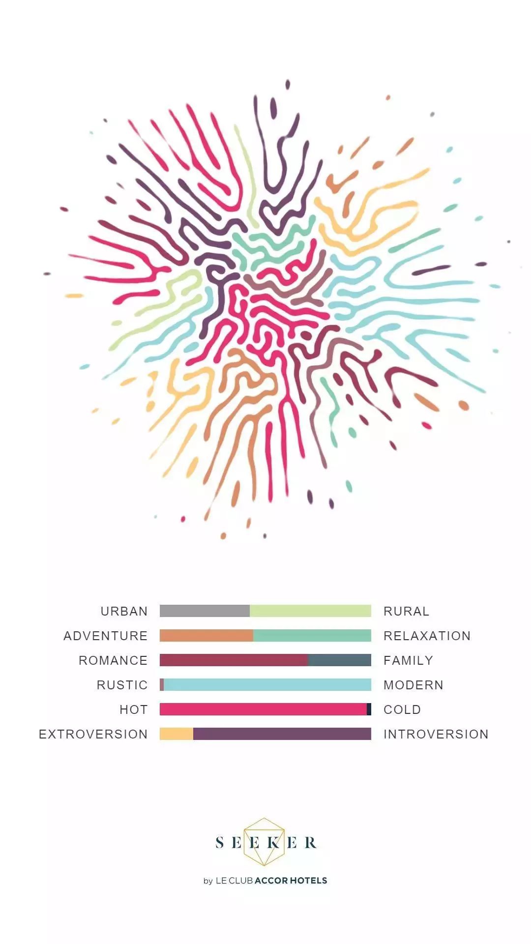 最后,算法會計(jì)算出六個關(guān)鍵指標(biāo)并以可視化的形態(tài)表示出來:城市或鄉(xiāng)村,冒險或輕松,浪漫或家庭,自然或現(xiàn)代,熱或冷,外向與內(nèi)向。每個人都可以得到像指紋一樣獨(dú)一無二的個性情感畫像和旅行資料,可以據(jù)此為你建議符合相同指標(biāo)的旅行目的地。