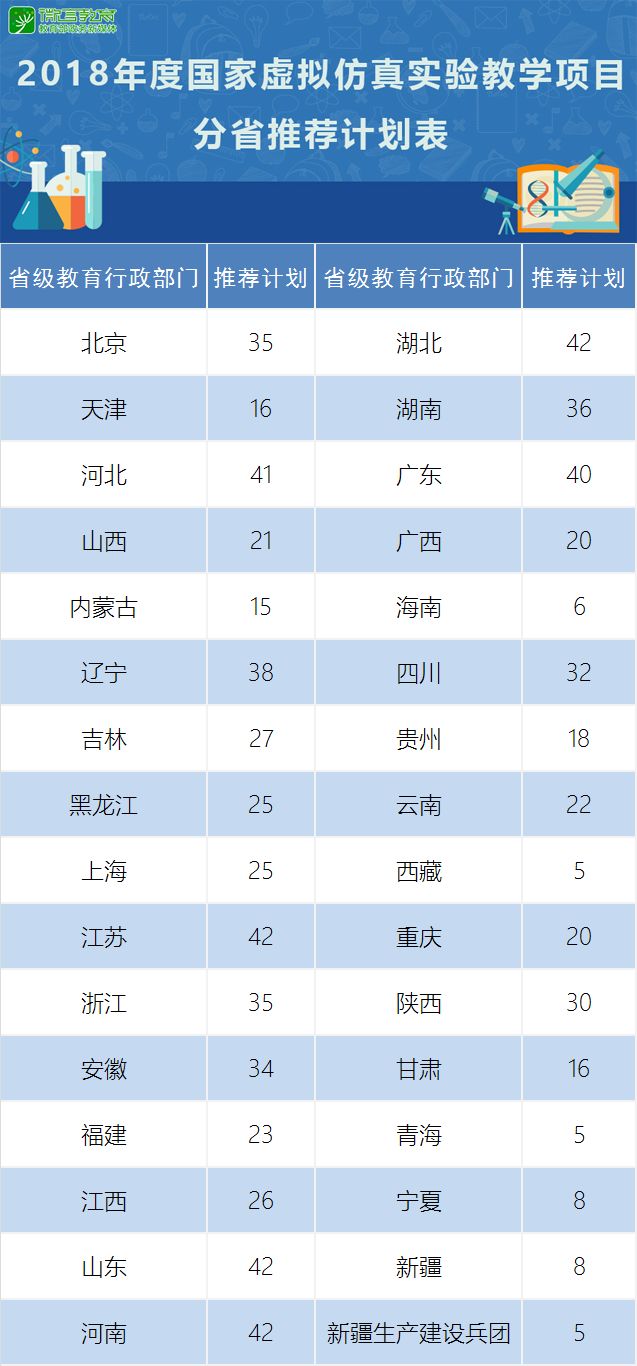 省級教育行政部門在認定分類范圍內(nèi),按照2018年度國家虛擬仿真實驗教學(xué)項目分省推薦計劃表提出推薦意見,并具函報送推薦結(jié)果。在推薦工作中,要積極支持軍隊高等院校申報的實驗教學(xué)項目。