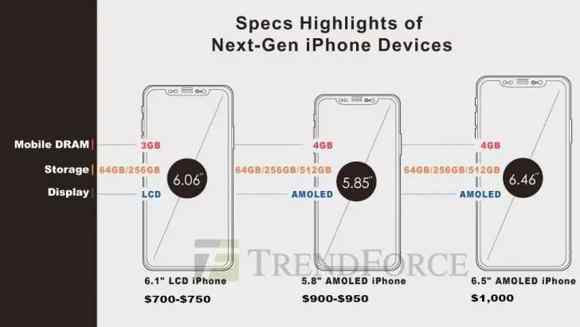 TrendForce認(rèn)為6.1英寸的LCD屏幕的iPhone售價(jià)是最便宜的,價(jià)格大約在700到750美元之間(約合人民幣4828元到5173元),較iPhone8貴那么一點(diǎn),它提供了3GB+64GB與3GB+256GB兩大存儲(chǔ)版本供用戶選擇。