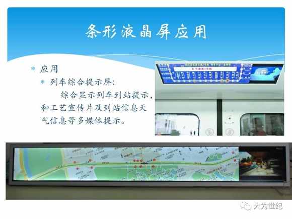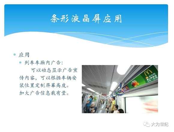 可以作為公交地鐵室內(nèi)報站屏、的士車頂屏,在地鐵、公交汽車顯示,出租車頂部,地鐵車廂,綜合顯示車輛到站信息和其它多媒體信息。