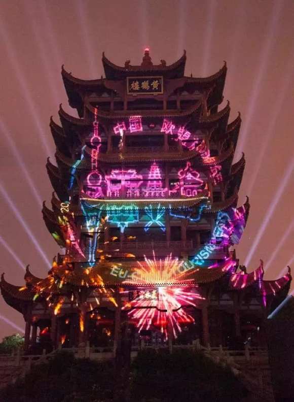 紅、藍(lán)、黃三色彩燈,配合主題燈光秀。將夜色中的黃鶴樓,烘托得美輪美奐。歐盟成員國(guó)代表及上合組織成員國(guó)代表共同見證這一盛事。