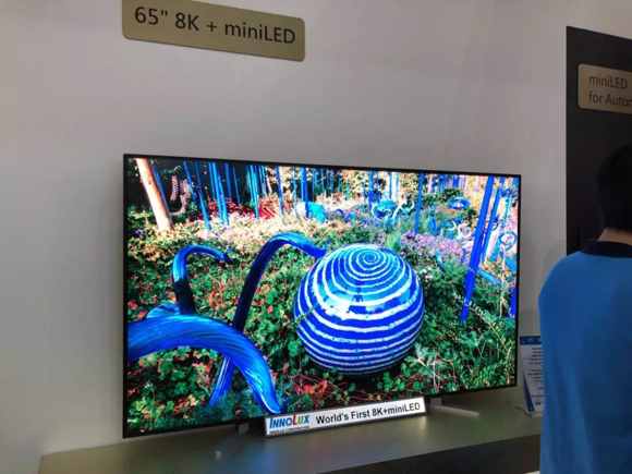 群創(chuàng)這次展示的65英寸AM Mini LED 8K顯示器,具備高色飽和度(>94%BT2020 cover ratio,125%NTSC)、高動態(tài)對比(1,000,000:1)、廣視角低色偏、藍光護眼無色偏等四大特點,預(yù)計將于2019年第二季量產(chǎn)上市。同時也將展示65英寸8K Mega-Zone,強調(diào)解析度是同尺寸OLED的4倍,在相同功耗下,亮度為4K OLED電視的兩倍以上。