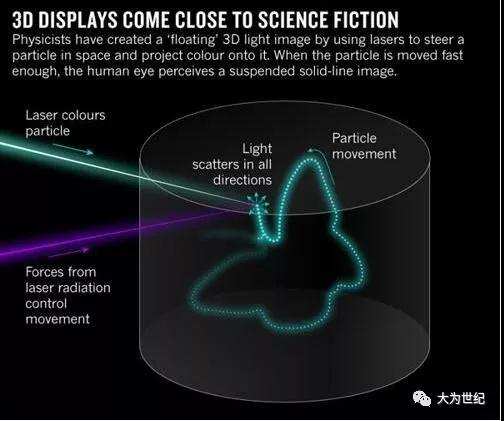 這種技術(shù)的原理就像是高度版本的Etch a Sketch應(yīng)用:通過一組由近似不可見的激光束所呈現(xiàn)的作用力來(lái)捕獲名為纖維素的植物纖維的單個(gè)顆粒,并且不均勻地將其加熱。這樣,研究人員就可以推拉纖維素。第二組激光則把可見光(紅色,綠色和藍(lán)色)投影至粒子上,照亮在空間中移動(dòng)的粒子。人類無(wú)法通過比每秒10次更快的速度來(lái)辨別圖像,所以如果粒子的移動(dòng)速度足夠快,它的軌跡就會(huì)如同一條實(shí)線,就像在黑暗中移動(dòng)的煙火一樣。如果圖像的變化速度夠快,它看起來(lái)就會(huì)像是在移動(dòng)。顯示圖像可以疊加在真實(shí)的對(duì)象上,這樣用戶就能在真實(shí)空間中環(huán)繞其走動(dòng)。