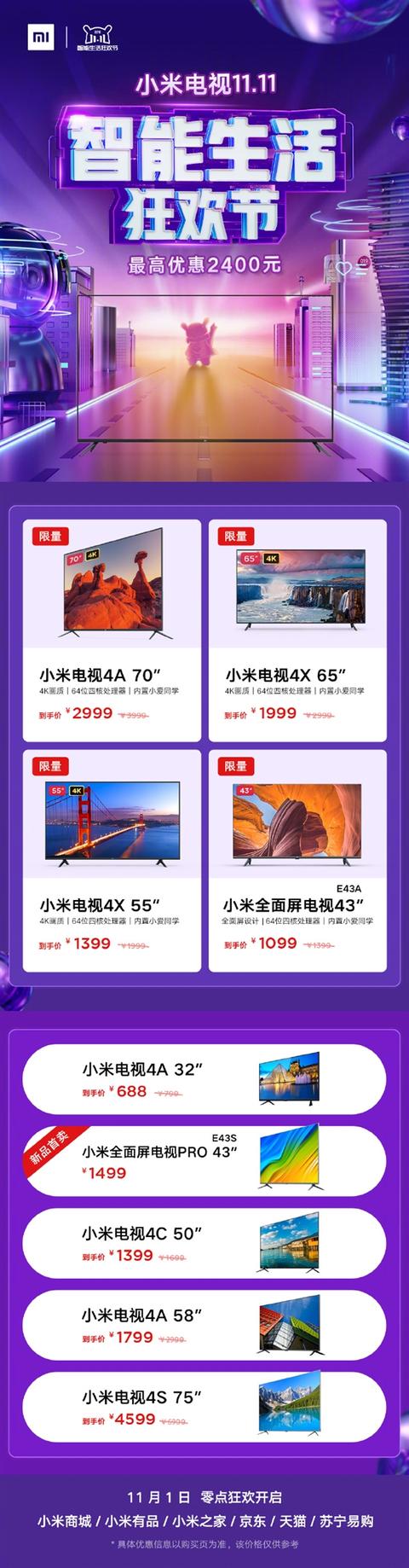 另外,還有多款小米電視降價(jià);小米全面屏電視Pro 43英寸、Redmi 紅米電視40英寸新品首賣......更多特惠,下圖了解一下: