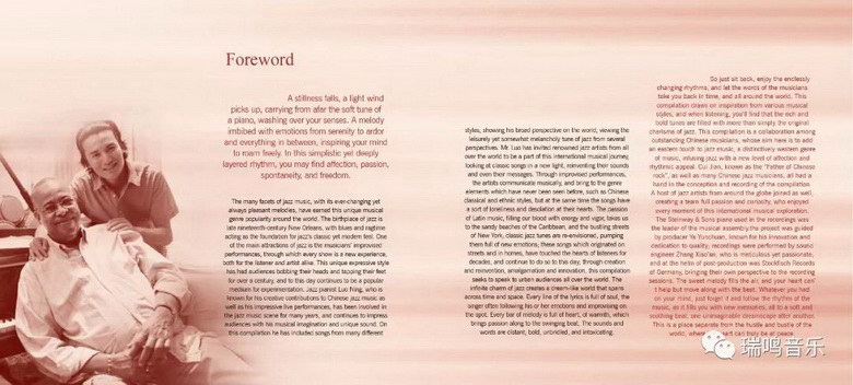 深沉而又奔放,憂郁而又舒展,身心陶醉在一個個深切、躍動、迷離的秘境里,忘卻時光流逝。專輯匯攏多彩音樂元素,聆聽時,豐富細(xì)膩而又熱情奔放的情調(diào)撲面而來,本來蘊藉深遠(yuǎn)的爵士樂顯得更為精彩紛呈,情趣盎然。國內(nèi)優(yōu)秀爵士音樂人同心齊力,期盼著充滿異國格調(diào)的音樂幼苗能夠深植東方溫潤的土壤中,崔健、劉元等多位藝術(shù)家一齊聚首,鼎力相助;國際爵士樂音樂家紛至沓來,帶著激情和新奇,享受著與中國藝術(shù)家演奏靈感碰撞出的全新藝術(shù)體驗。九尺斯坦威鋼琴彈奏出的飽滿、華麗的琴音,帶動全部音樂情緒,名貴之外,更見藝術(shù)張力。著名音樂制作人葉云川延續(xù)瑞鳴創(chuàng)作理念,廣聚一流音樂家,傾力打造一流藝術(shù)精品,務(wù)求盡善盡美;錄音大師張小安盡心竭力,忘我投入;德國老虎魚的全程后期制作及母版制造,全面烘托現(xiàn)場微妙氛圍。讓憂傷看到自己,讓歡樂感動自己,這一刻隨性的心情,跟著動感節(jié)拍和柔滑旋律,幻化著一幕幕引人入勝情景,拋開了憂擾,浸沒在緩緩流動的愉悅與舒適中……