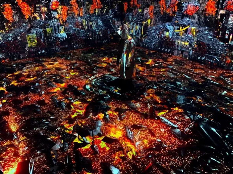 觀眾的現身即是開啟作品的信號,隨即影像墻上會出現八種身份標簽各異的女性角色如同火焰般在游走。直到最后,她們也沒能擺脫自身欲望的纏繞,最終要化作無望、渺小的灰燼