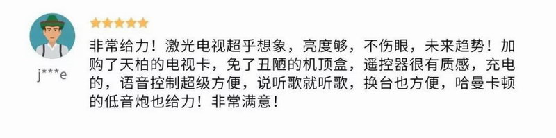 我們在線上商城搜集已購買海信激光電視的用戶評論時,發(fā)現(xiàn)一些很走心的評論。比如,有些用戶很喜歡海信激光電視帶來的4K高清畫質(zhì),搭配環(huán)繞立體音響,秒變K房也是很多用戶喜愛的地方,而海信激光電視,健康護(hù)眼的體驗,也得到了不少用戶高度的評價。