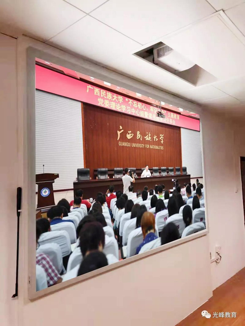 廣西師范大學(xué)也采用光峰高亮投影機(jī)+電動幕布方案。顯示畫面明亮清晰,色彩還原度真實,顏色均衡,亮度與顏色并存。