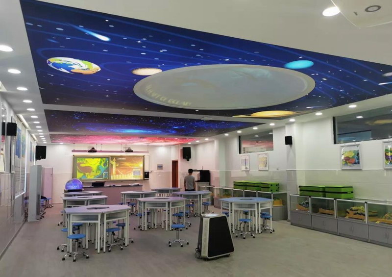 深邃的藍(lán)色、小組學(xué)習(xí)式的課桌椅以及四周的地理知識窗簾和地形地貌模型,羿飛地理專用教室一改傳統(tǒng)教室的設(shè)計(jì)布局,以更清新自由的形象展現(xiàn)在師生面前。