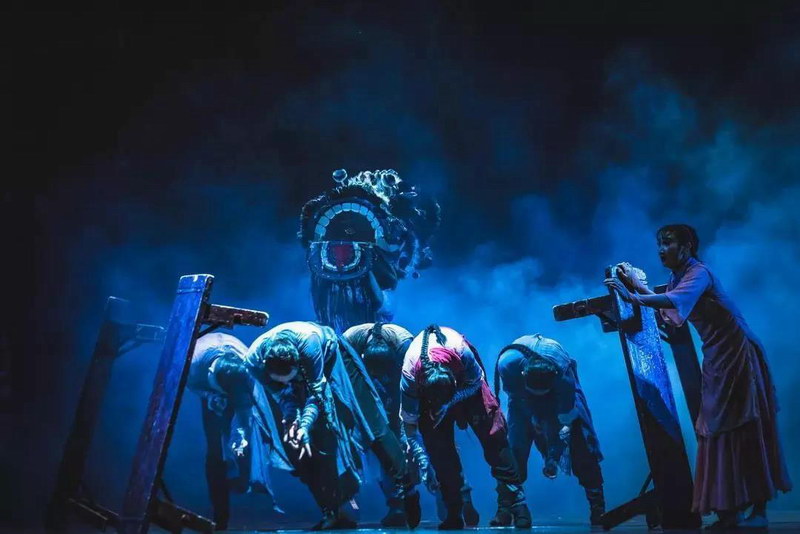 劇目的舞臺空間由巨型的竹編獅頭龍骨構(gòu)成,配合燈光的方向、角度、光位高低的變換,在完美渲染劇情氛圍的基礎(chǔ)上完成舞臺空間的不斷切換。