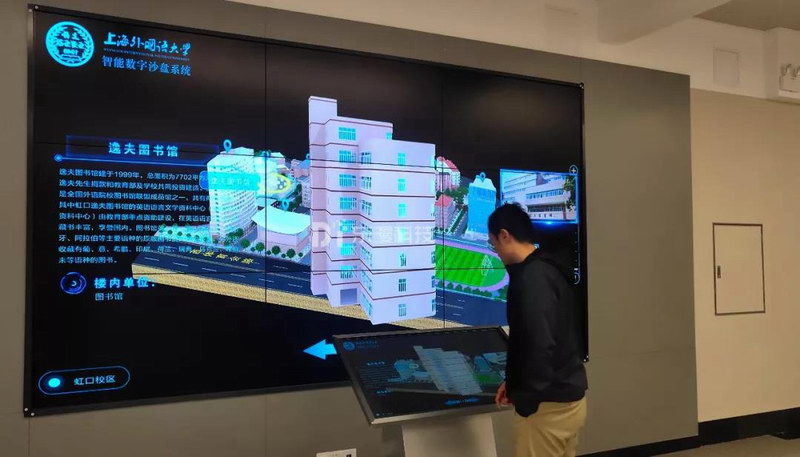 本項目的內(nèi)容是介紹上海外國語大學(xué)。沙盤是一個學(xué)校的微縮,向觀眾提供一個鳥瞰的角度觀察學(xué)校,通覽全局。但傳統(tǒng)的沙盤模型只能在一個時間維度上表現(xiàn),對于一個長達幾十年歷史的學(xué)校規(guī)劃來說,表現(xiàn)力遠遠不足。虛擬電子沙盤可動態(tài)地展現(xiàn)一個學(xué)校的全貌,在不同的時間維度上跳躍變化,真實、充分的還原三組場景的校區(qū)歷史變化和校園景觀現(xiàn)狀。結(jié)合最新的沉浸式體驗方式,讓觀眾得到身臨其境的觀賞體驗。