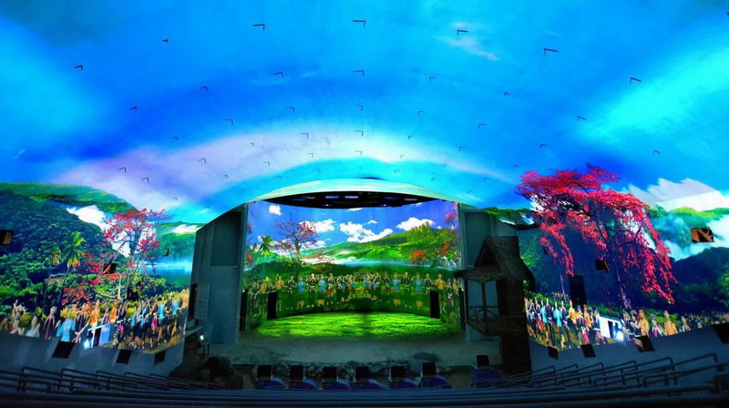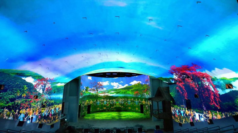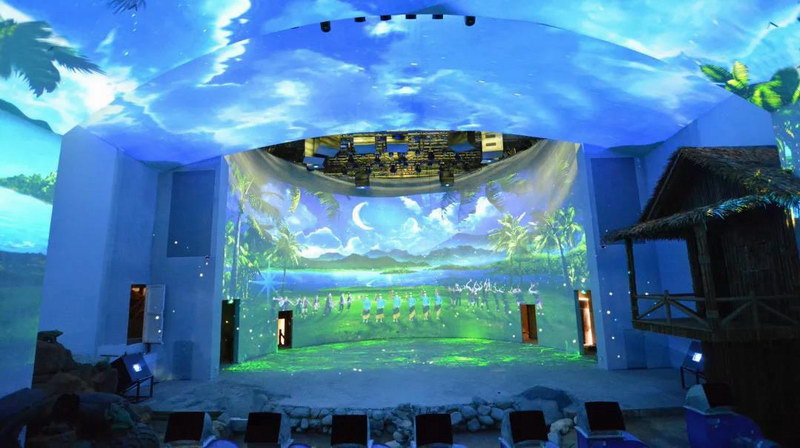 超感5D沉浸式海島臺(tái)風(fēng)體驗(yàn)館作為海南檳榔谷黎苗文化旅游區(qū)重要景點(diǎn)之一,共采用14臺(tái)NEC PA803UL+投影機(jī)(采用恒溫箱隱藏式安裝)以3D-Mapping技術(shù)、270°穹頂和全息空間成像打造。