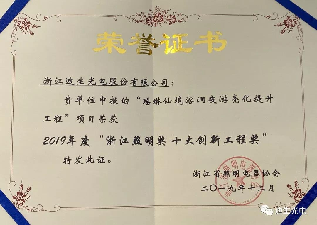 作為行業(yè)發(fā)展的積極建設者和有力推動者,浙江迪生光電一舉攬獲“浙江省照明電器協(xié)會優(yōu)秀會員單位、最佳合作伙伴”、迪生光電董事長李建成榮獲“浙江省照明電器協(xié)會卓越貢獻獎”、企業(yè)申報的“瑤琳仙境溶洞夜游亮化提升工程”項目榮獲“2019年度浙江照明獎十大創(chuàng)新工程獎”,共計獲得協(xié)會授予的四個重要獎項。