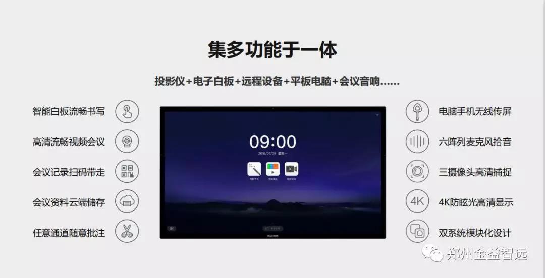 會(huì)議每時(shí)每刻都在發(fā)生,人們通過會(huì)議交流信息、達(dá)成共識、協(xié)同共創(chuàng)。會(huì)議是昂貴的商業(yè)行為,設(shè)備、人員、時(shí)間無一不是成本。在早期的會(huì)議室里,顯示昏暗的幕布,混亂不堪的線材,以及設(shè)備調(diào)試等待的時(shí)間,讓我們感到會(huì)議效率被大大降低了。我們設(shè)想,在企業(yè)會(huì)議室里,應(yīng)該有一面清晰的會(huì)議屏,在上面書寫沒有空間限制,設(shè)備可以無線連接,會(huì)議不再需要人工記錄,無論我們在哪里,都能和業(yè)務(wù)伙伴身臨其境地溝通。