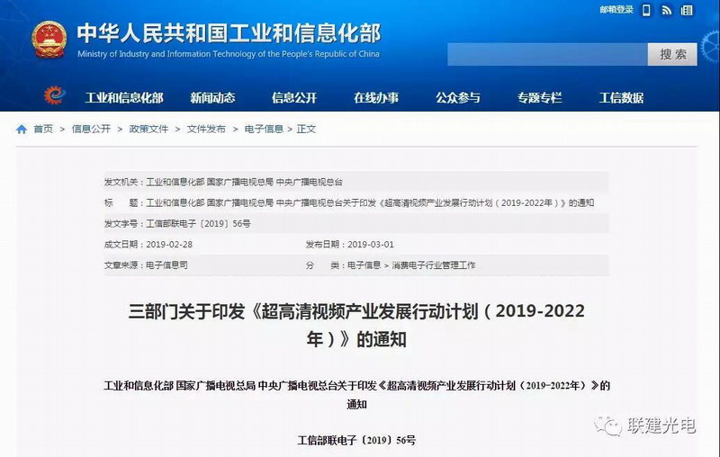 工信部發(fā)布《超高清視頻產(chǎn)業(yè)發(fā)展行動(dòng)計(jì)劃》,聯(lián)建光電贏來(lái)新機(jī)遇!