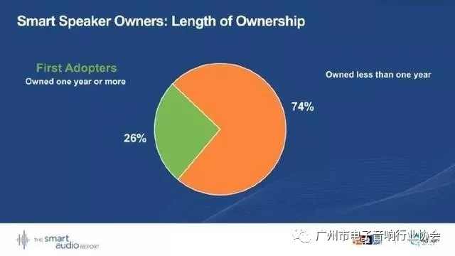 第一批智能音箱采用者擁有音箱一年及以上的占26%;擁有時間少于一年的人占74%