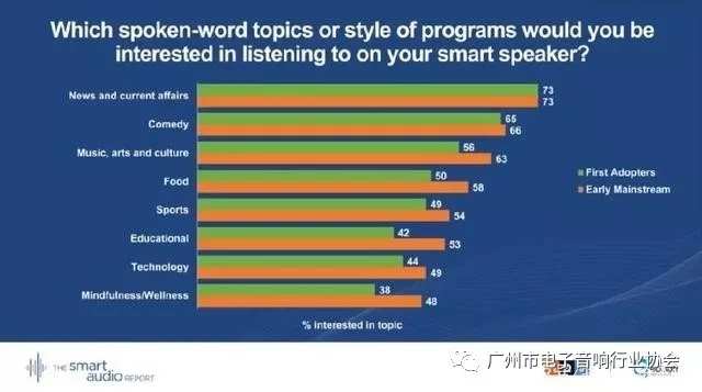 73 %的智能音箱使用者把“新聞時事”作為他們最感興趣的話題。在打算購買另一臺智能音箱的智能揚聲器所有者中,有五分之三的人為了在家里更多的房間里聽新聞。
