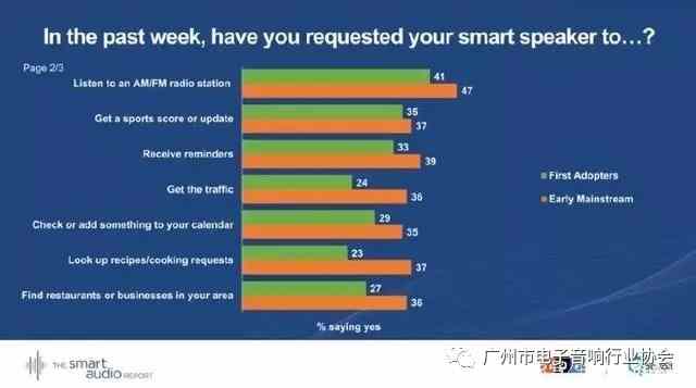 第一批智能音箱采用者通過使用智能音箱控制其他家用電器,而早期主流消費者則將智能音箱的功能擴展到了點餐、打電話、獲取交通信息和查詢購物信息上。