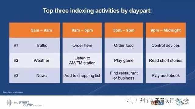 在晚上9點到凌晨這一時段內(nèi),智能音箱的排行前三位的索引任務是控制家用電器,讀短篇故事和播放音頻有聲讀物。