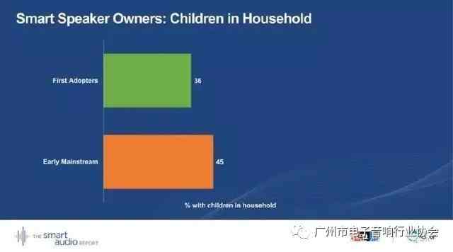 上圖顯示,第一批智能音箱采用者群體中,有孩子的家庭占據(jù)36%;早期主流消費者中,有孩子的家庭占45%。