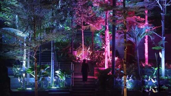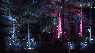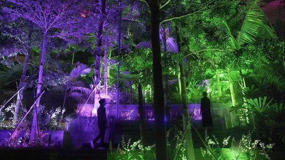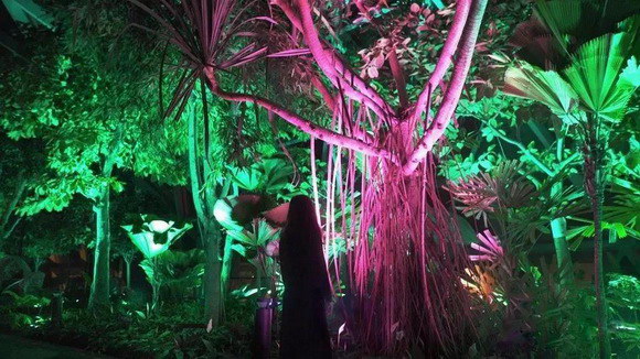 每棵樹都配有獨(dú)立的光源,在夜色中忽明忽暗的閃光,宛如綠色植物在盡情的呼吸。這場展覽讓游客與自然進(jìn)行一場親密的互動,植物通過感應(yīng)經(jīng)過的人們,逐漸變化其燈光的顏色,像是在訴說自己的故事,用獨(dú)特的語言對經(jīng)過的朋友打招呼,觀眾仿佛融入了整片森林。