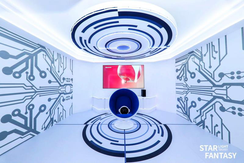 每年的“星光范特西”都會成為年度潮流風向標,展示前衛(wèi)、social、年輕的品牌氣質。今年的時尚盛典增加了未來感、沉浸感、科幻感的體驗元素,海信激光電視主題太空艙當仁不讓地成為全場科技擔當。海信4K激光電視百吋超薄大屏懸掛在“太空艙”里,宛如一面可以望向多維宇宙的窗口。在宇宙藍的燈光環(huán)境下,明星們紛紛帶上專業(yè)的宇航員頭盔,體驗宇宙駕駛的快感。