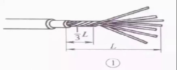 先將剝?nèi)ソ^緣層的芯線頭散開并拉直,再把靠近絕緣層1/3線段的芯線絞緊,然后把余下的2/3芯線頭按圖示分散成傘狀,并將每根芯線拉直。