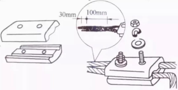 連接前,先用鋼絲刷除去導(dǎo)線線頭和溝線夾線槽內(nèi)壁上的氧化層和污物,涂上凡士林鋅膏粉(或中性凡士林),然后將導(dǎo)線線卡入線槽,旋緊螺栓,使溝線夾緊緊夾住線頭而完成連接。為防止螺栓松動(dòng),壓緊螺栓上應(yīng)套以彈簧墊圈。