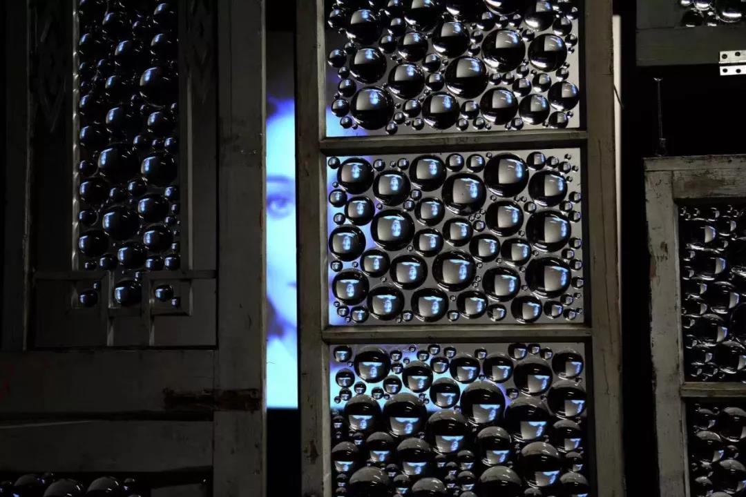 不算空蕩的房間,黑漆漆的墻,還有復(fù)古的窗,上面粘滿一顆顆凸起的玻璃,透射著同一個(gè)畫面,有人、有眼,像置身在另外一個(gè)世界,有著迷幻、空洞卻充滿故事的感覺(jué)。