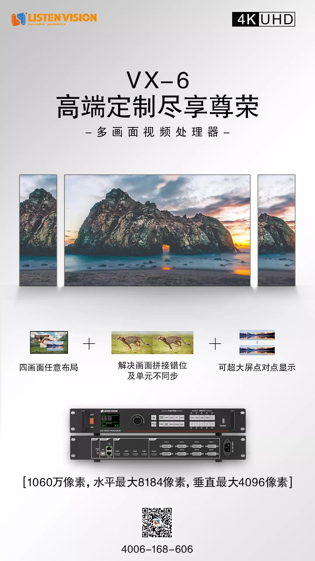 作為一款高端視頻處理設(shè)備,VX-6擁有1060萬(wàn)像素的自定義輸出分辨率,支持四畫(huà)面拼接顯示,并支持4K,可進(jìn)行實(shí)時(shí)監(jiān)控、集中控制,并采用專為 LED 顯示屏設(shè)計(jì)的拼接處理技術(shù),避免了拼接錯(cuò)位與不同步性,圖像處理效果也大大增強(qiáng)。