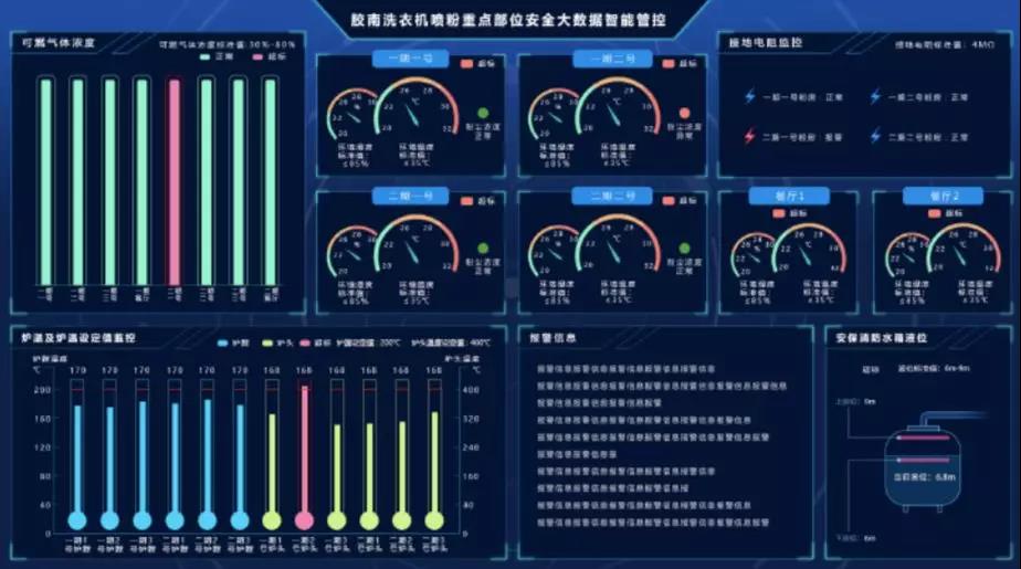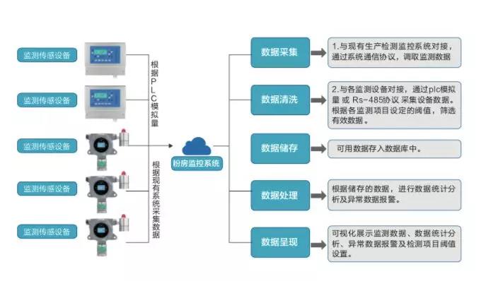通過粉房重點部位監(jiān)測系統(tǒng),實現(xiàn)產(chǎn)線在連續(xù)運行狀態(tài)下,自動采集工藝參數(shù)、爐溫數(shù)據(jù)、接地電阻、粉塵濃度及粉房溫濕度等數(shù)據(jù)信息并進行統(tǒng)一分析,當(dāng)數(shù)據(jù)異常時進行報警。